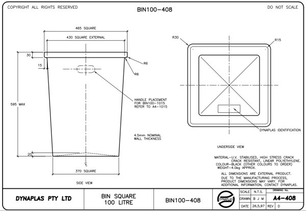 FREQUENTLY ASKED QUESTIONS DYNAPLAS 100 LITRE SQUARE BIN What is the Dynaplas 100 litre square bin used for? The Dynaplas 100 litre square tapered bin is widely used in fast food restaurants, shopping centres, food courts and commercial kitchens. It is commonly used inside tray return cabinets and waste stations in restaurants such as McDonald's, Subway, KFC and other major fast food chains. What material is the Dynaplas 100 litre bin made from? The bin is manufactured in Australia using rotational moulding technology from high stress crack resistant, UV stabilised polyethylene. This material is extremely durable, hygienic and easy to clean. Why are Dynaplas bins used by major fast food brands? Dynaplas bins are trusted by major brands because they are strong, long lasting and hygienic. The seamless polyethylene construction prevents cracks and makes them ideal for high traffic environments such as restaurants and food courts. Are Dynaplas bins suitable for food environments? Yes. Dynaplas bins are made from food grade polyethylene which makes them safe, hygienic and easy to clean for use in food service environments. Will the bin crack or break under heavy use? Dynaplas bins are designed for heavy duty commercial use. The rotational moulding process creates thick 4–5mm walls that are highly impact resistant and built to withstand years of daily use. Can the bin be used outdoors? Yes. The polyethylene material is UV stabilised which means the bin can be used both indoors and outdoors without fading or becoming brittle. Why is the bin tapered? The tapered design allows the bin to be easily removed from cabinets and waste stations for emptying and cleaning. It also helps the bin fit neatly into tray return systems used in restaurants. What are the specifications of the Dynaplas 100 litre square bin?