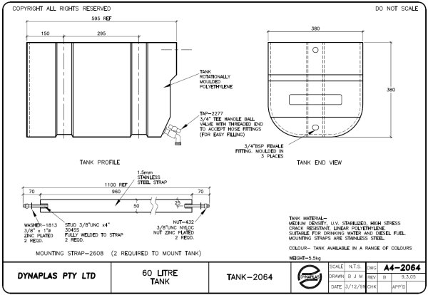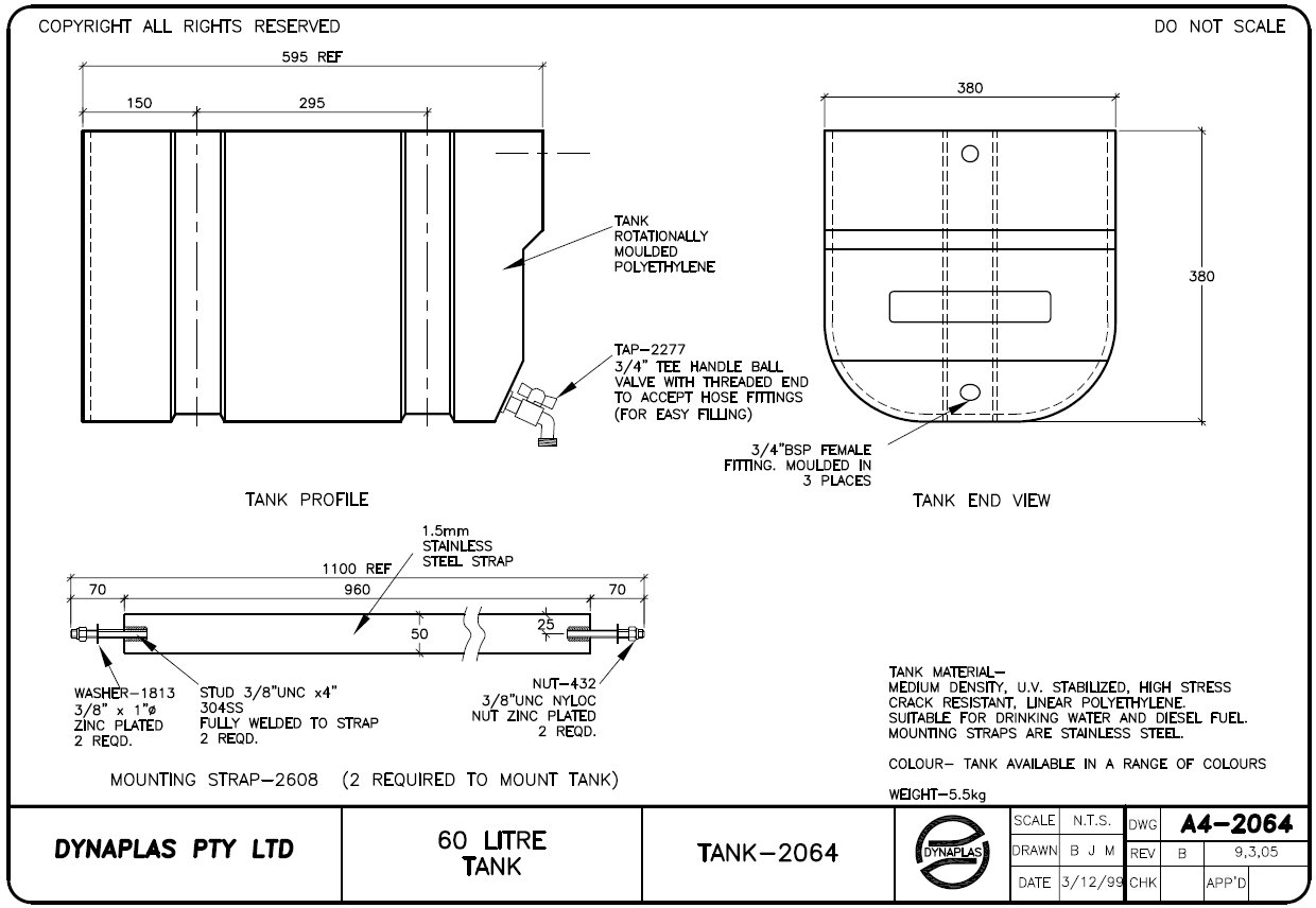 The tank is supplied with a chrome plated brass T-handle tap for easy water access. Stainless steel mounting straps are available to securely mount the tank to the vehicle chassis or frame.