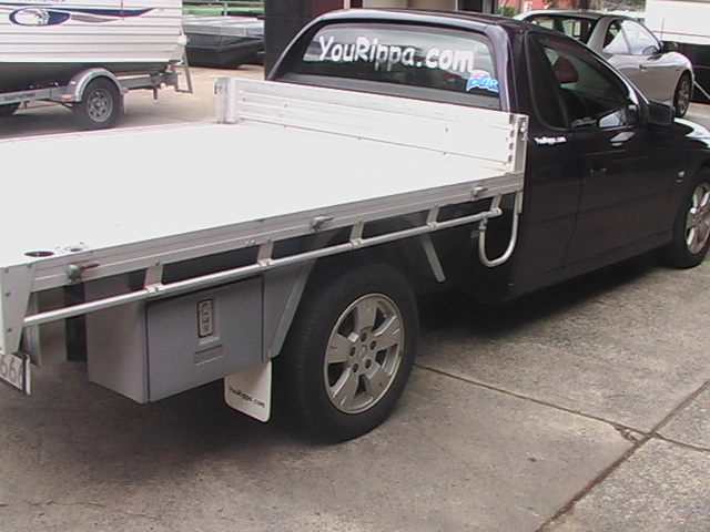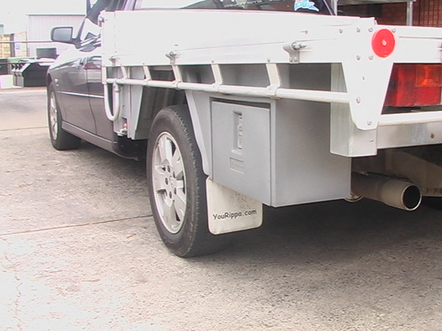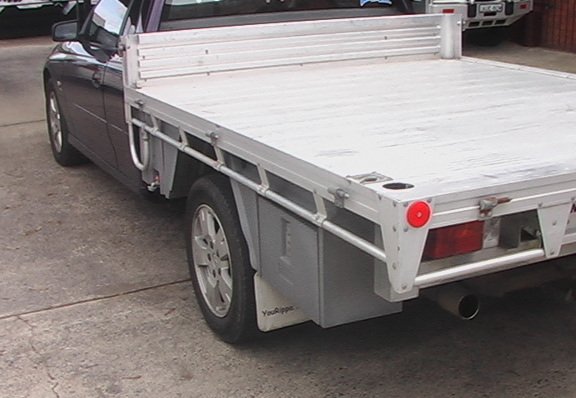 Products on this flat top, 30 litre water tank with stainless steel straps, Mudguards and Ute Tool Boxes